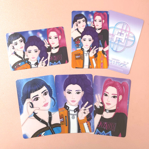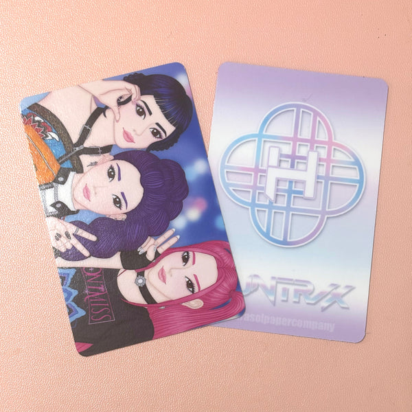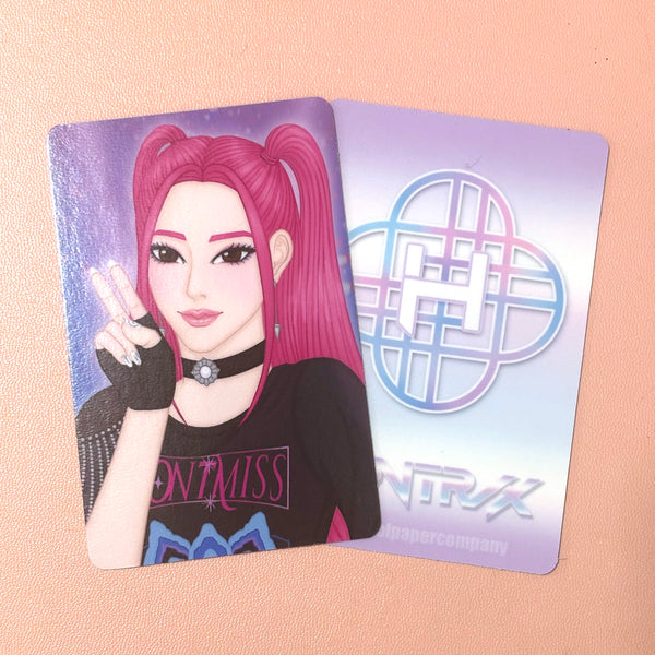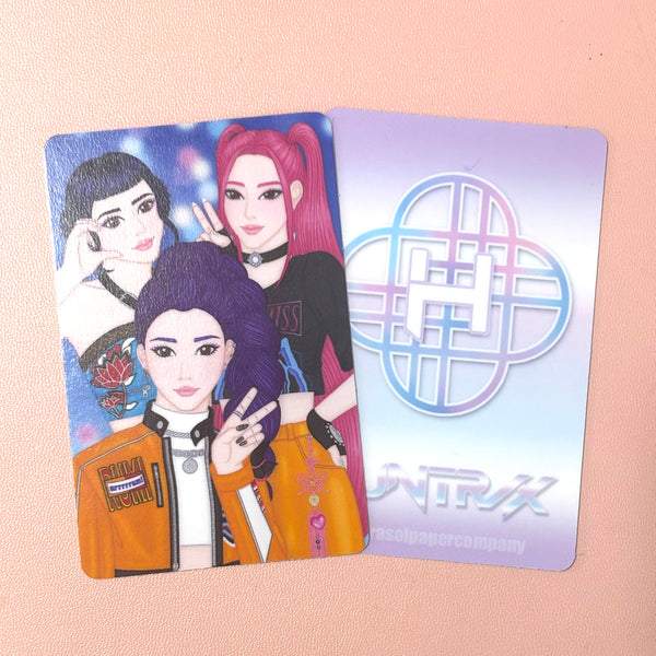Double sided glossy photocards featuring Huntrix art from our How It's Done collection. One side features the member(s) with the group logo on the other side.