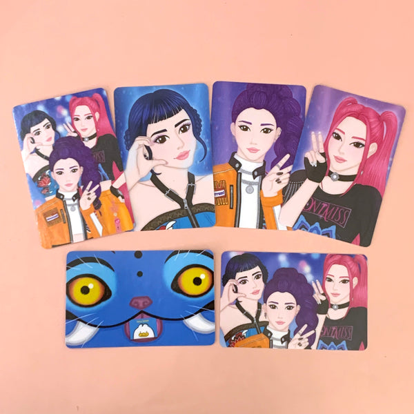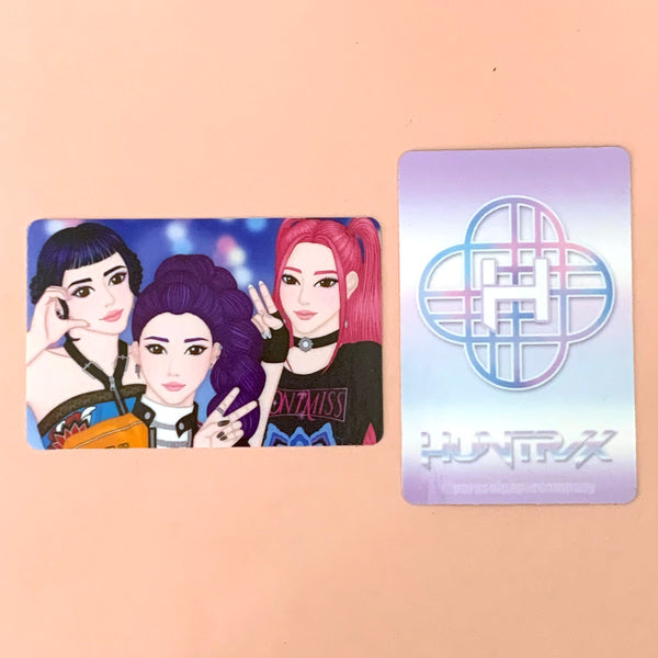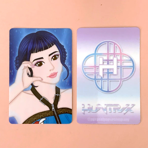 Double sided glossy photocards featuring Huntrix art from our How It's Done collection. One side features the member(s) with the group logo on the other side.